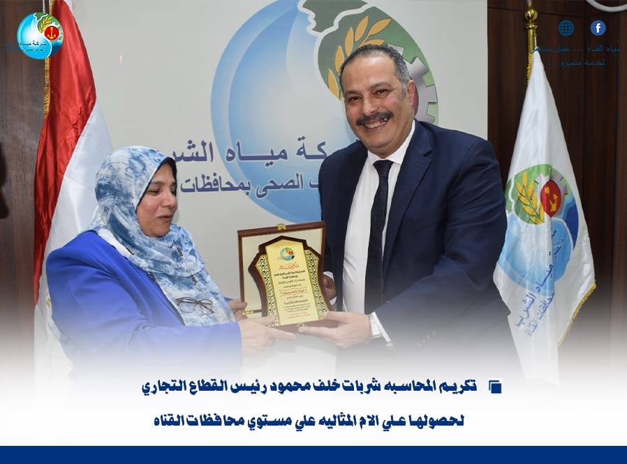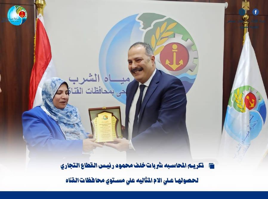 كرّم اللواء أركان حرب مهندس أحمد رمضان، رئيس مجلس الإدارة والعضو المنتدب لشركة مياه الشرب والصرف الصحي بمحافظات القناة، المحاسبة / شربات خلف محمود رئيس القطاع التجاري بالشركة، بعد اختيارها “أمًا مثالية” على مستوى محافظات القناة، وذلك بحضور أعضاء مجلس إدارة الشركة، تقديراً لمسيرتها المتميزة وإسهاماتها البارزة.
