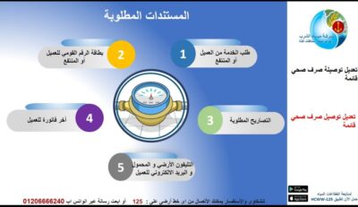 تعديل توصيلة صرف صحي قائمة: المستندات المطلوبه: ١-طلب الخدمة من العميل أو المنتفع. ٢-بطاقة الرقم القومى. ٣-التصاريح المطلوبه. ٤-آخر...