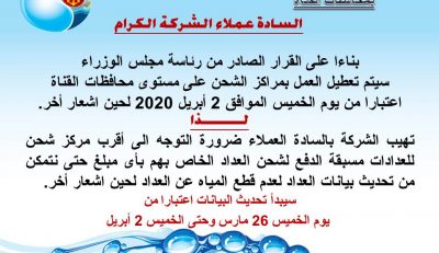 انطلاقا من المسؤولية المجتمعية لشركة مياه الشرب والصرف الصحى بمحافظات القناة ، أعلن السيد اللواء عبد الحميد عصمت رئيس...